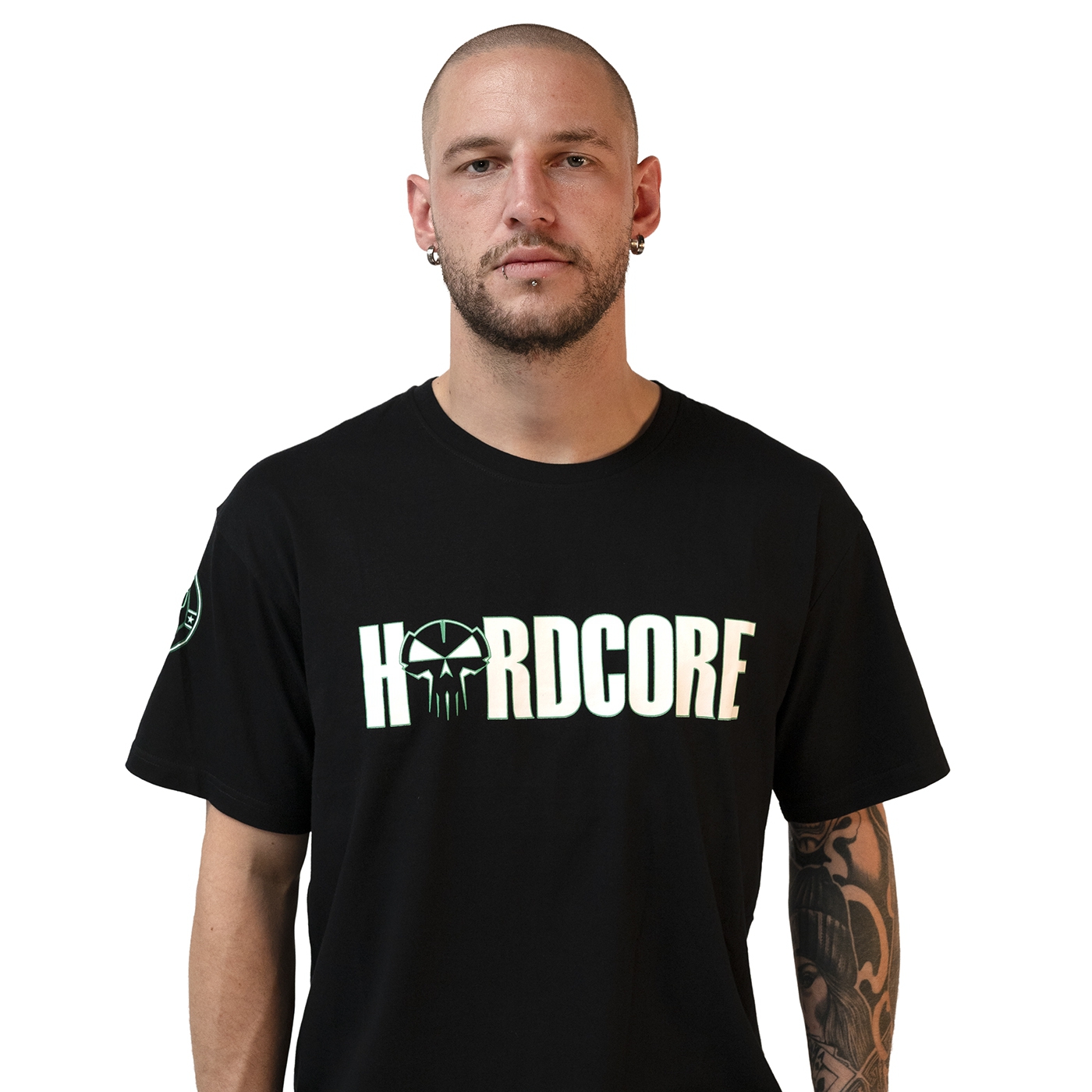Black RTC T-Shirt, featuring bold green and white prints. The front showcases "Hardcore" lettering, the back displays a large Rotterdam Terror Corps logo. The sleeves are detailed with RTC inscriptions and a Hardcore - Gabber, Rotterdam Terror Corps stamp. This T-shirt offers a slightly oversized fit for a relaxed look. The model is wearing size S.