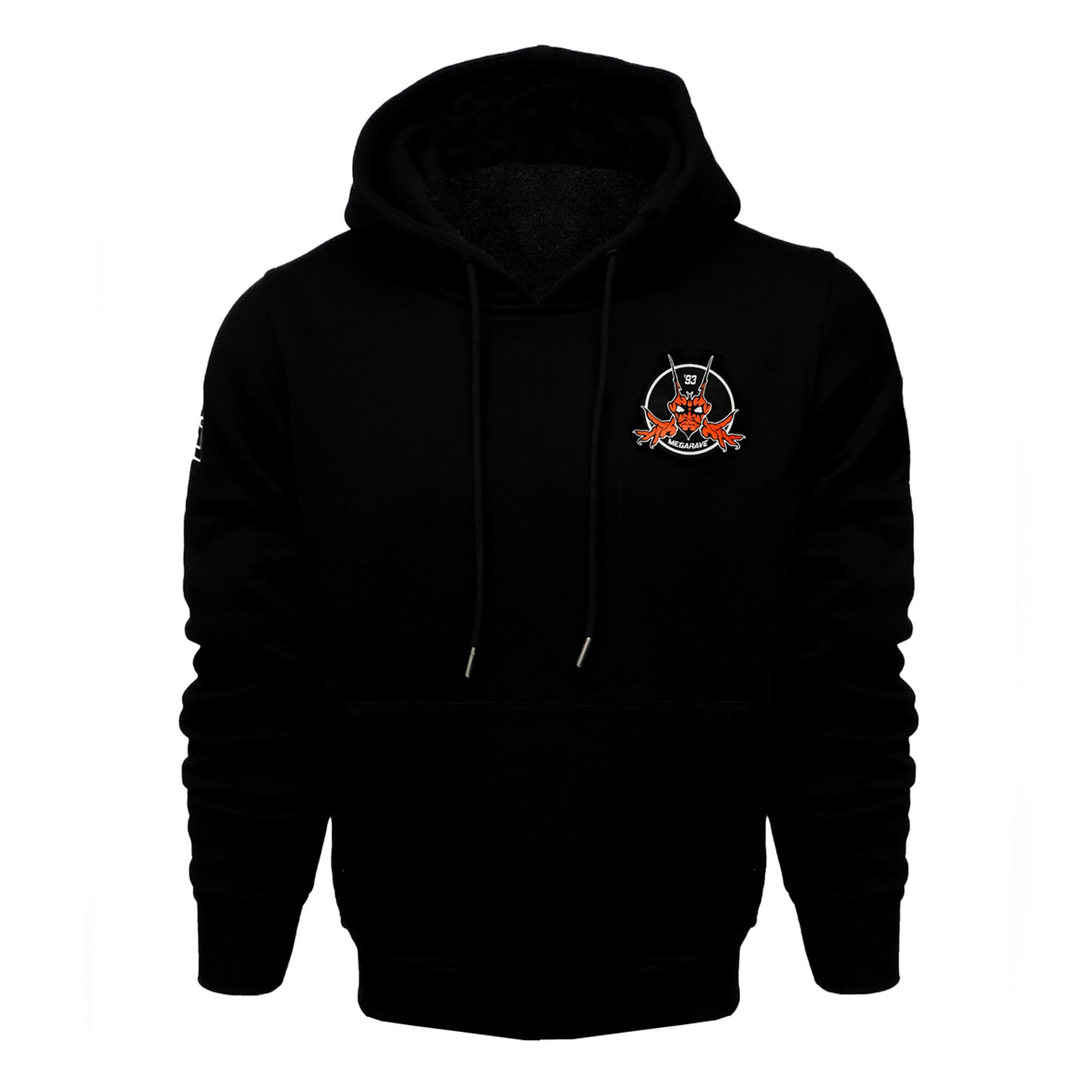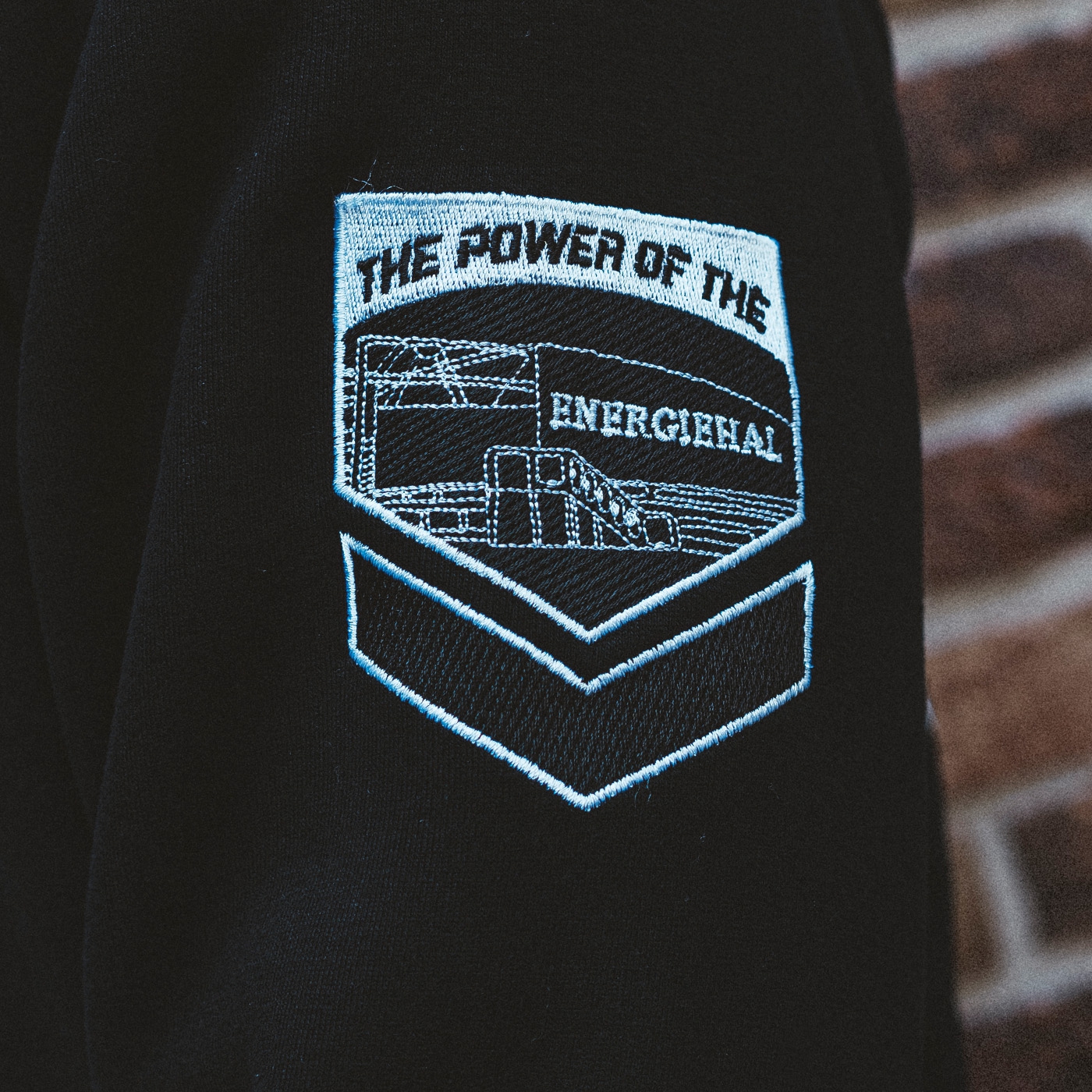 Soft black hoodie with a big Megarave logo on the back, '93' stitched on the right sleeve, and 'The Power of Energiehal' stitched patch on the left sleeve. Small Megarave on the left chest.