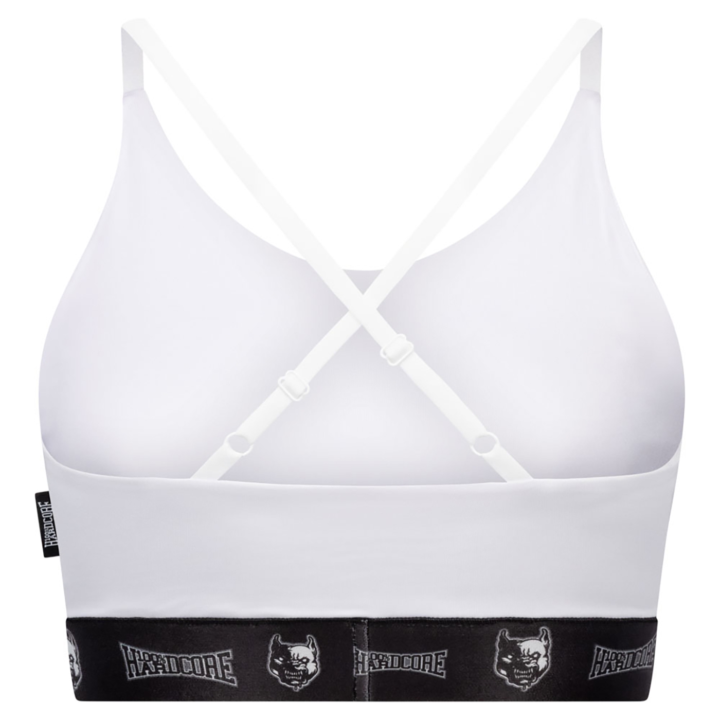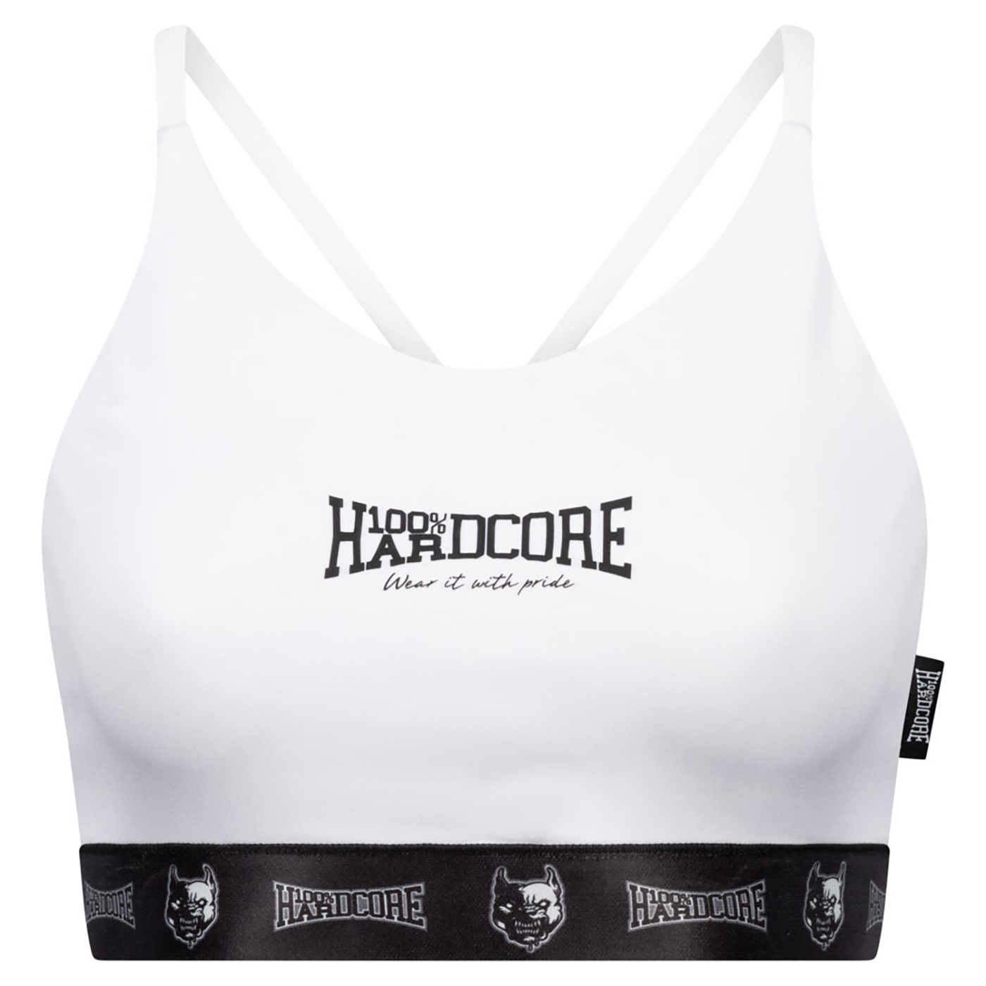 This 100% Hardcore sports top is white with a black band embroidered with 100% hardcore.