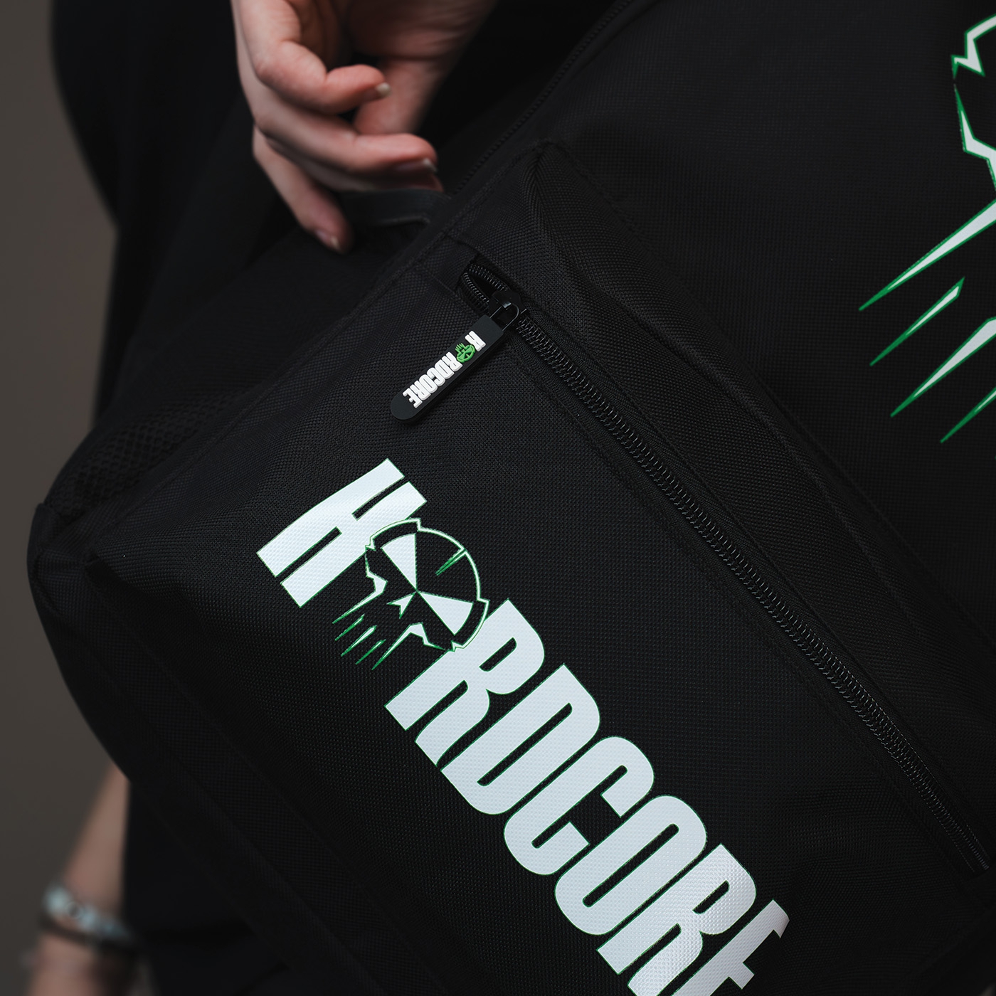 Green zippers with the text "Hardcore".