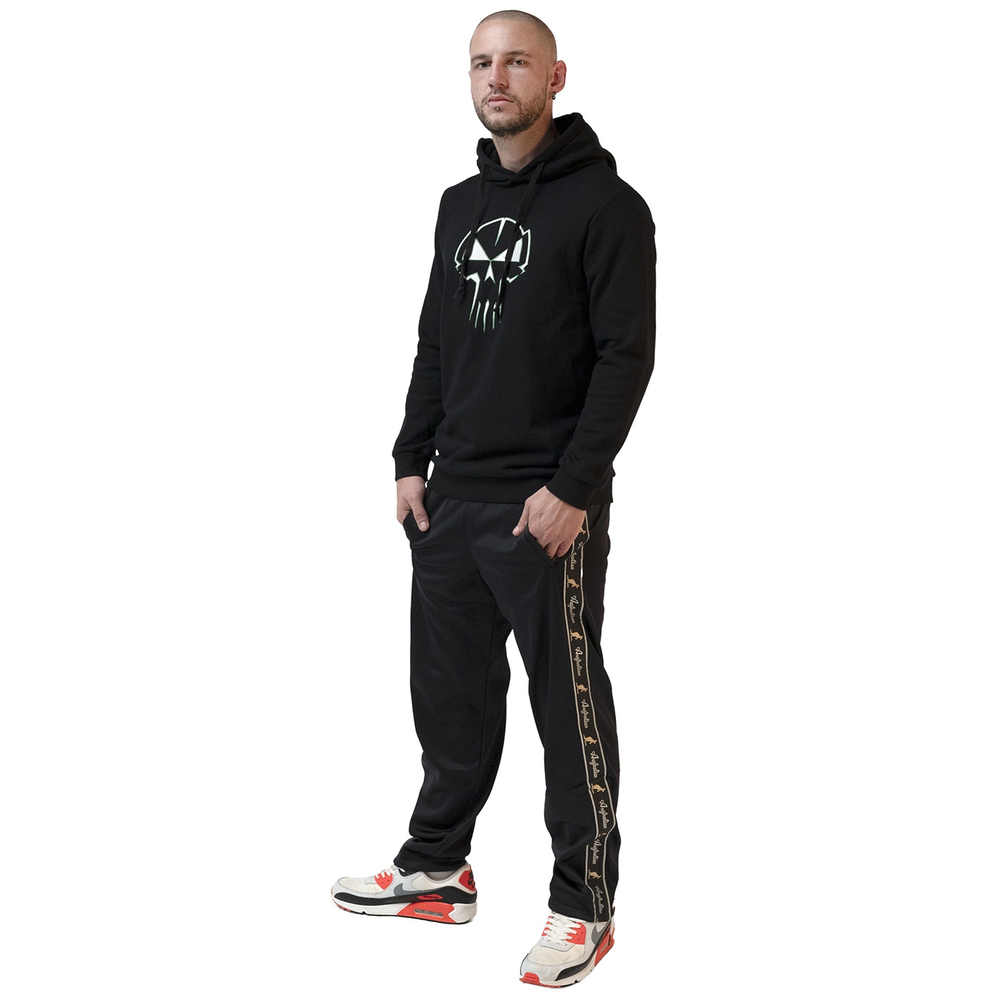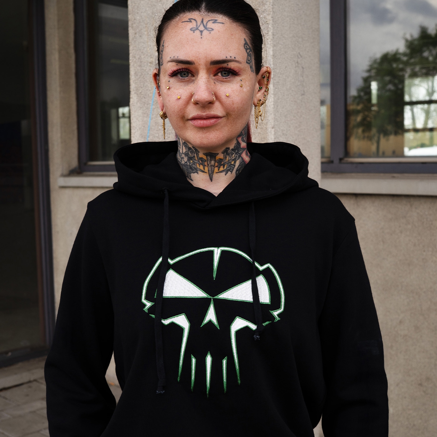 Black hoodie featuring a large embroidered Rotterdam Terror Corps logo. The back has a bold printed RTC logo. All prints and embroidery are done in white and green.