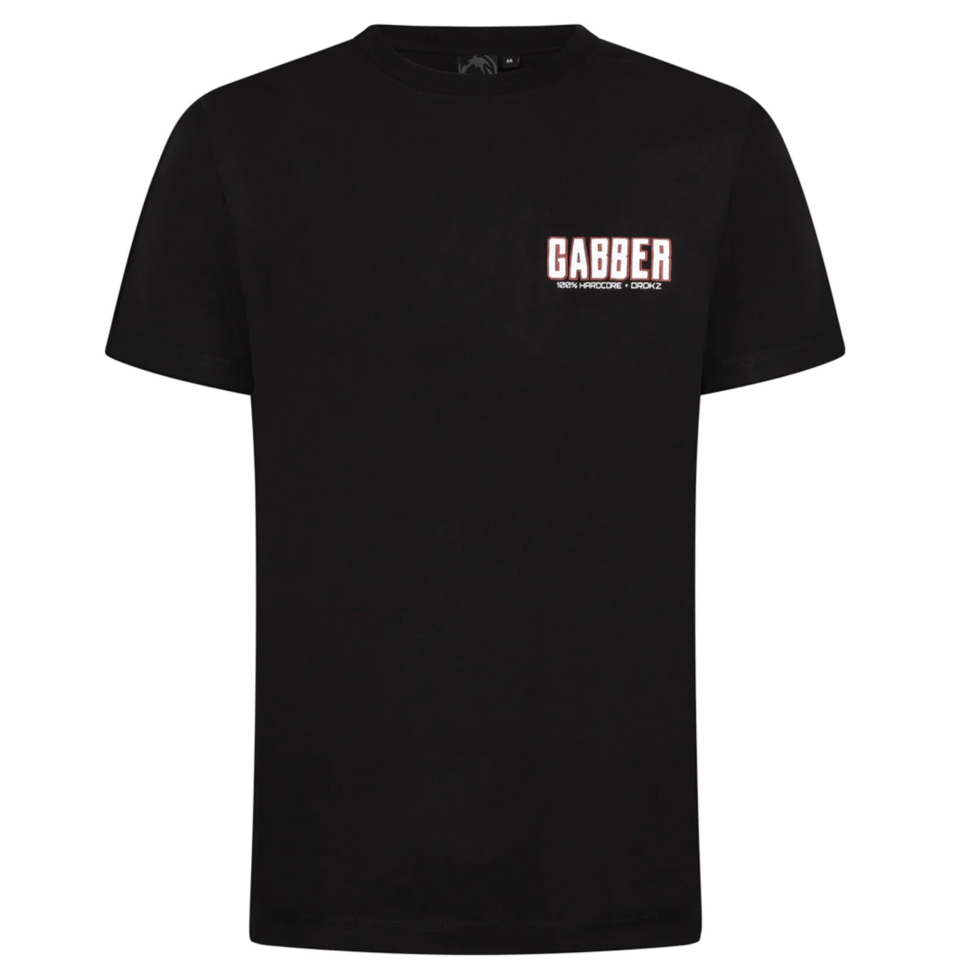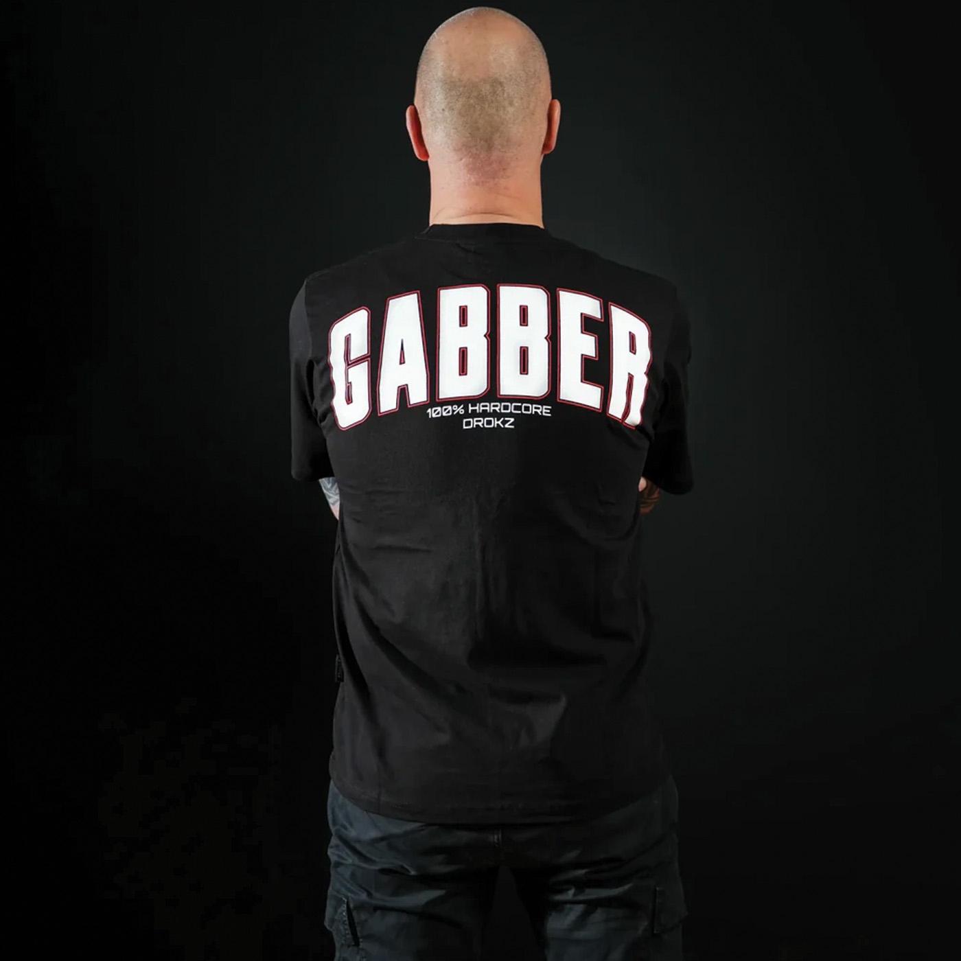 Black T-shirt featuring a small Gabber text on the chest and a large Gabber text on the back. Part of the exclusive Drokz x 100% Hardcore collaboration.