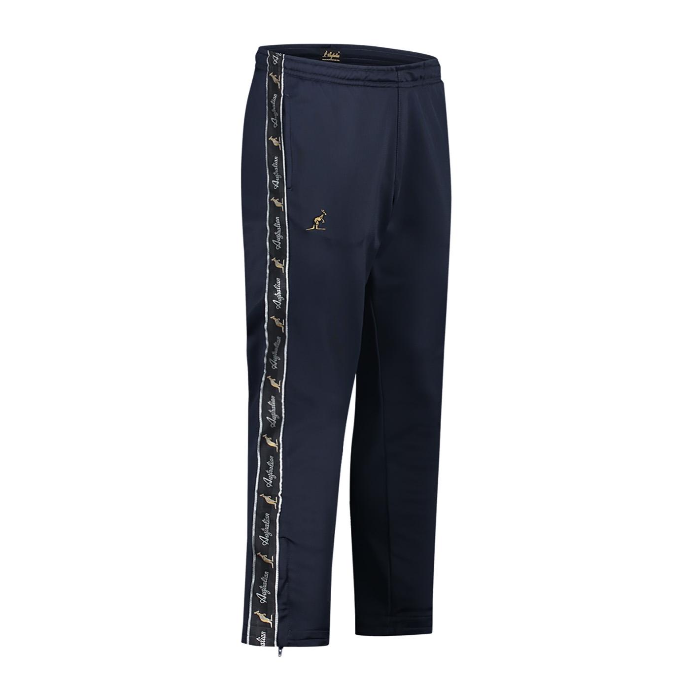 A sleek black trim runs along both trouser legs, finished with subtle gold kangaroos and silver letters, which gives the trousers an exclusive and refined look. The gold embroidered Australian logo on the right thigh underlines the authenticity and craftsmanship of these trousers. The elastic waistband with lace-up closure ensures a perfect fit, while the zippers at the pockets and legs provide a functional and stylish finish.