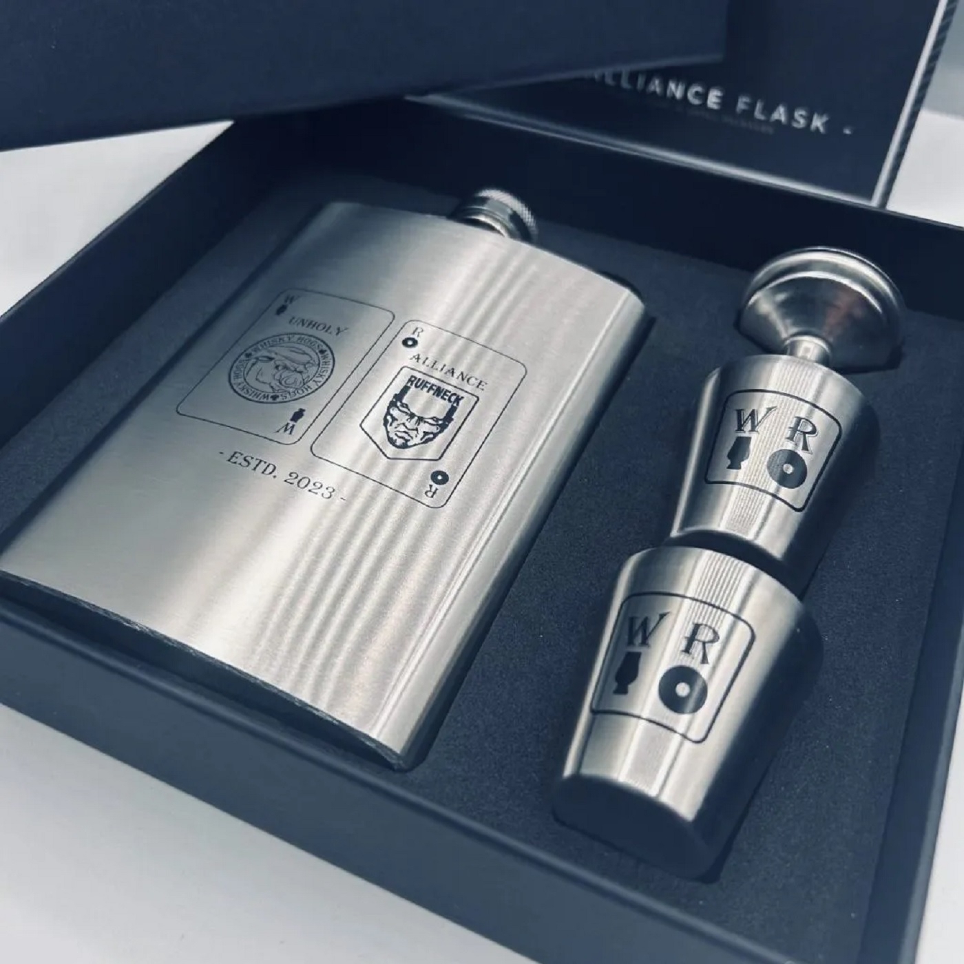 - Two stainless steel cups – both featuring Ruffneck’s whiskey emblem and the Whisky Hogs’ mark.