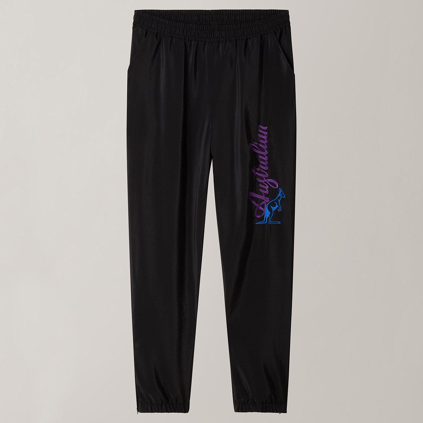 Black Australian parachute pants with a bold purple vertical script logo and vibrant blue kangaroo emblem. Crafted from lightweight, smooth-touch fabric for effortless comfort and everyday movement. Designed with an elastic waistband and adjustable drawstring for a secure fit, breathable mesh lining, slanted side pockets, and elastic cuffs for a sharp, modern streetwear silhouette. Perfect for statement styling with a clean athletic edge.
