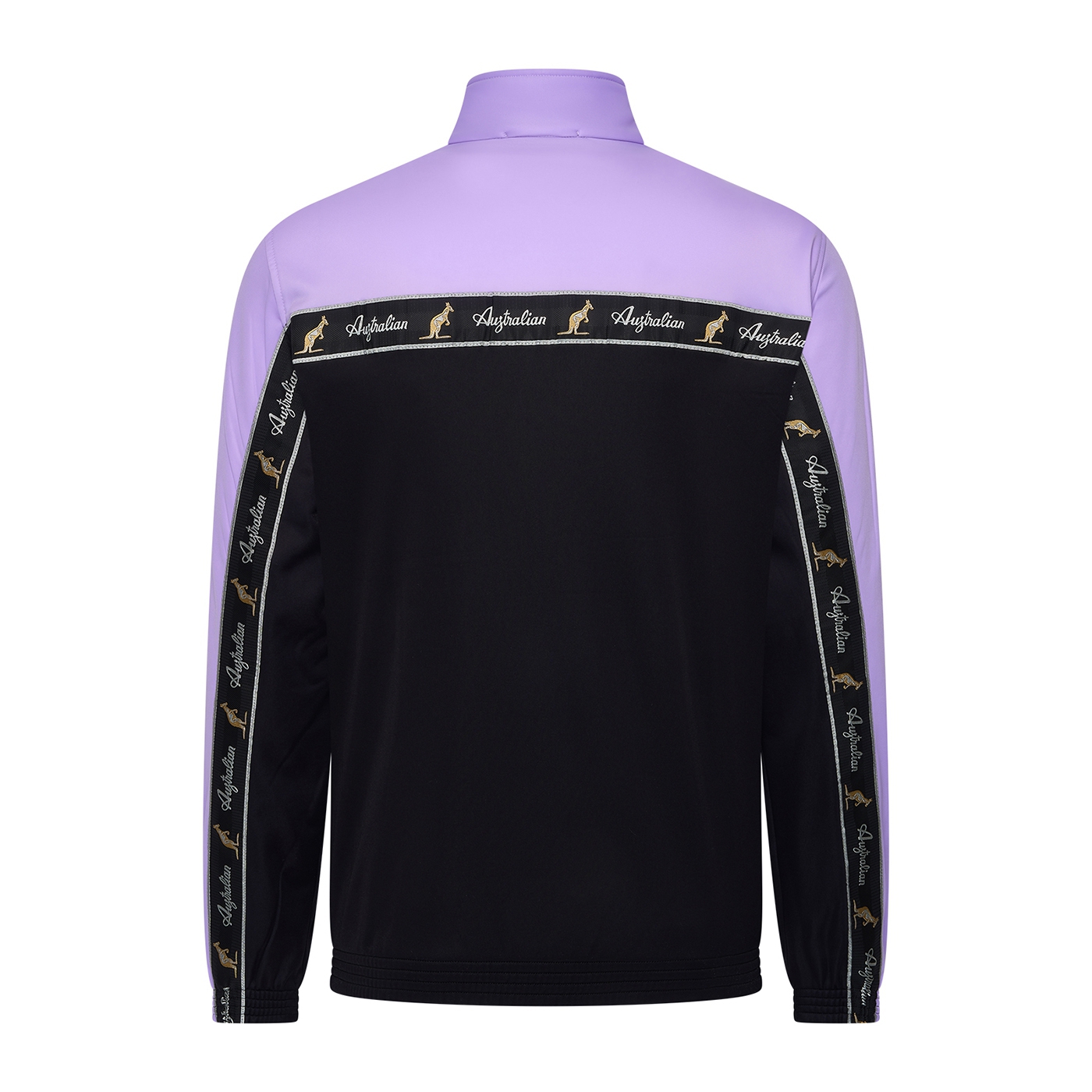 This Australian jacket is lavender at the top and black at the bottom with a black bies.