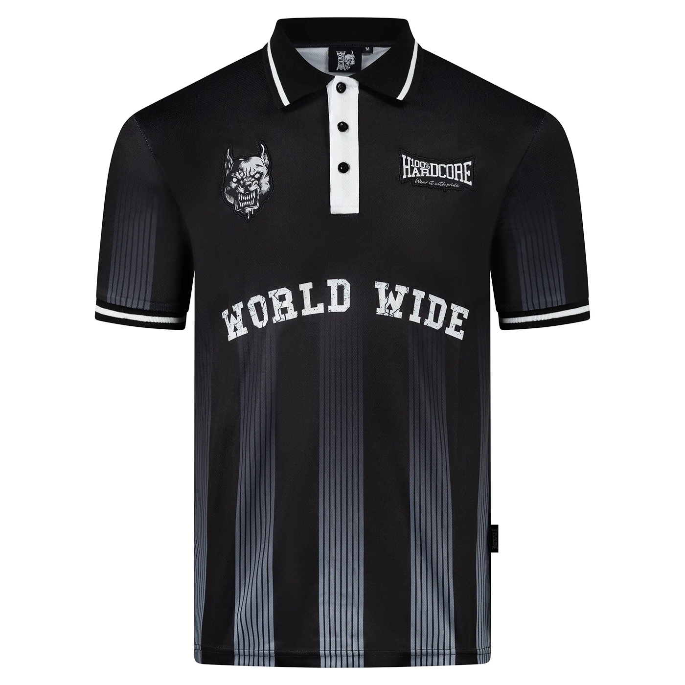 The 100% Hardcore Worldwide football shirt features a large Rage Worldwide print on the back and embroidered logos on the chest. The black color and sleek design give the shirt a simple and recognizable look.